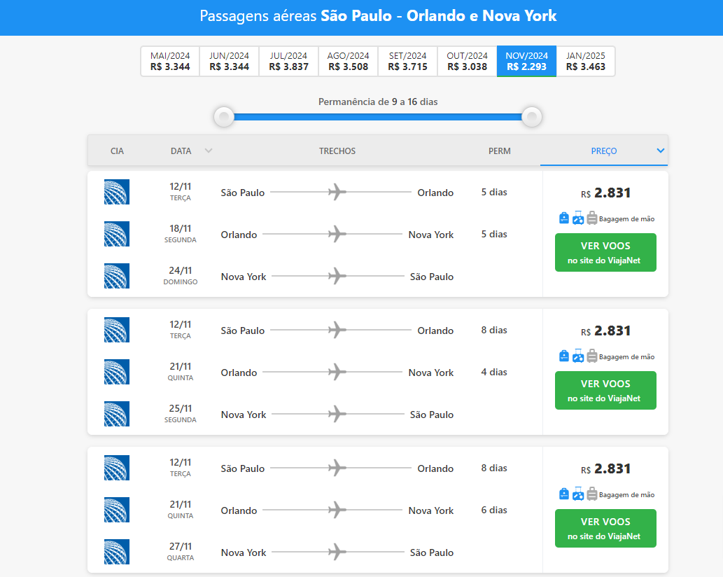 Repita o procedimento para a Saída de NYC e vá anotando as melhores Tarifas.
